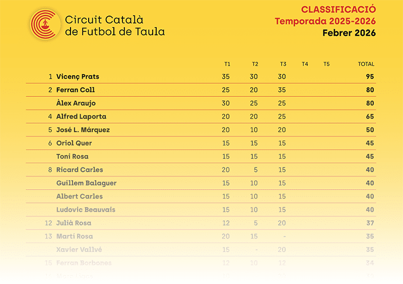 El Circuit Català de Futbol de Taula va viure aquest diumenge 1 de febrer una jornada per al record a Mataró, seu del tercer torneig de la temporada 2025-2026. La cita va marcar un rècord absolut de participació, amb un total de 36 jugadors, la xifra més alta registrada fins ara en un torneig del circuit.